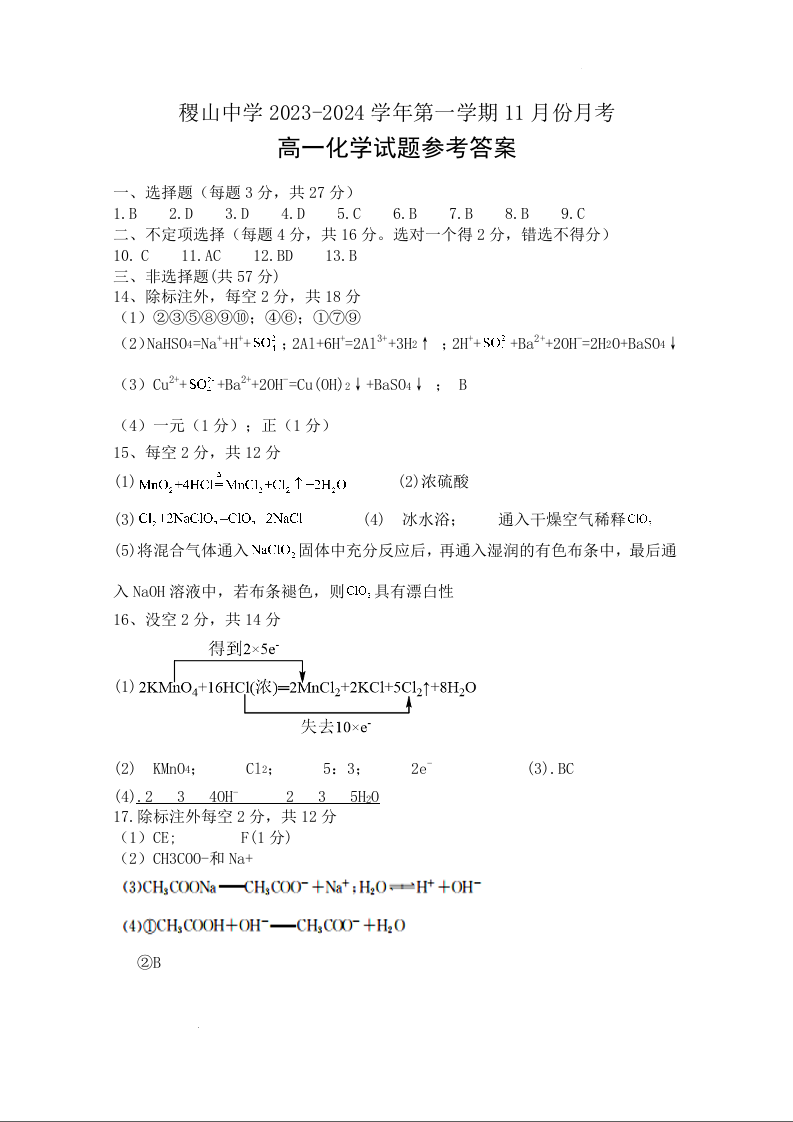 山西省运城市稷山县稷山中学2023-2024学年高一上学期11月月考化学答案