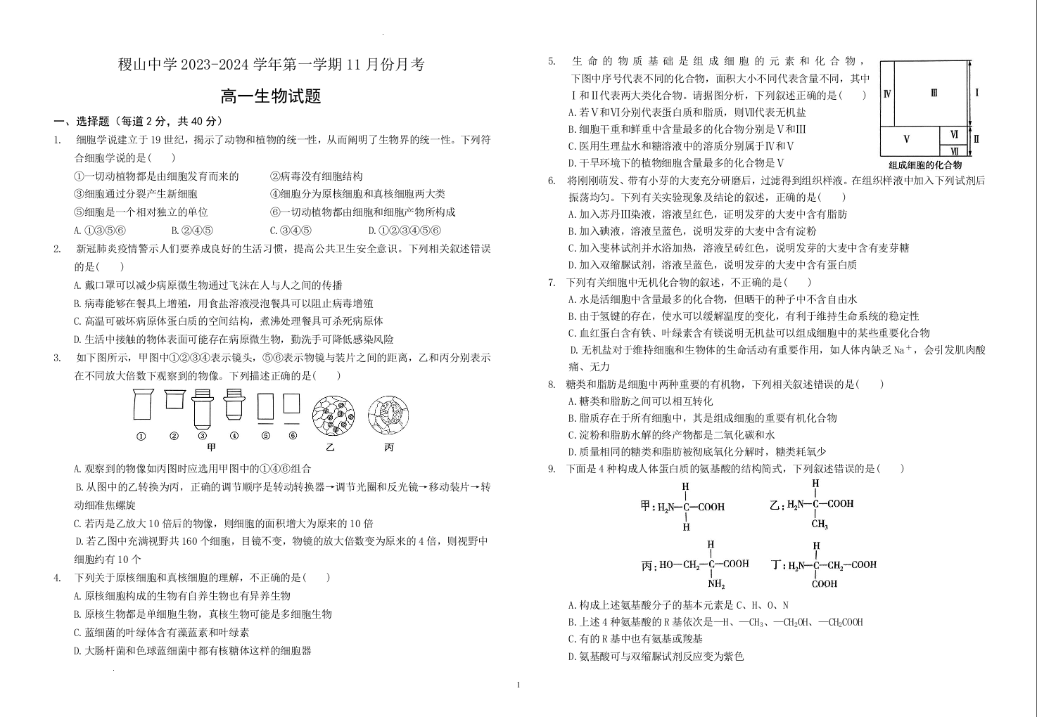 山西省运城市稷山县稷山中学2023-2024学年高一上学期11月月考生物