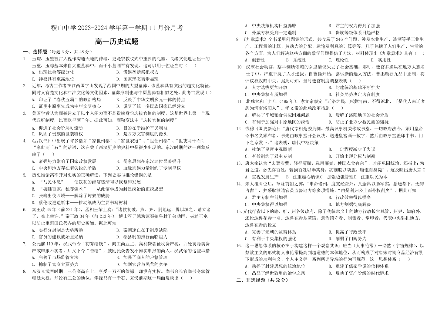 山西省运城市稷山县稷山中学2023-2024学年高一上学期11月月考历史
