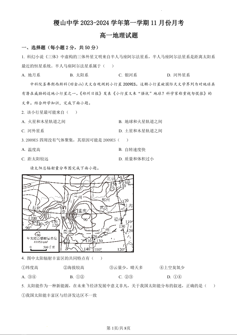 山西省运城市稷山县稷山中学2023-2024学年高一上学期11月月考地理(原卷版)