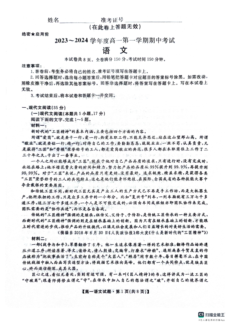 陕西省安康市2023-2024学年高一上学期期中考试语文