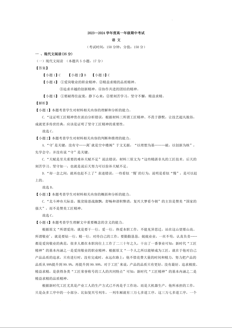 陕西省安康市2023-2024学年高一上学期期中考试语文答案