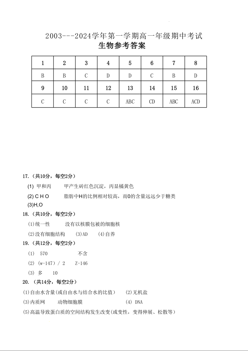 陕西省安康市2023-2024学年高一上学期期中考试生物答案