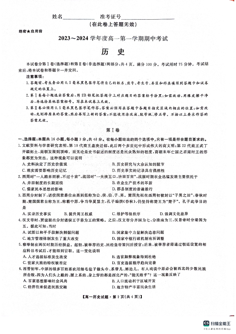 陕西省安康市2023-2024学年高一上学期期中考试历史