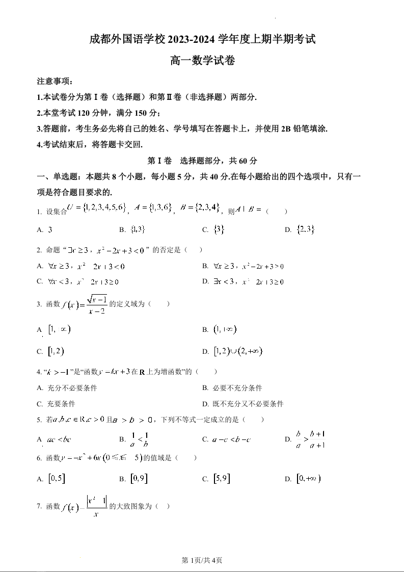 四川省成都外国语学校2023-2024学年高一上学期期中考试数学(原卷版)