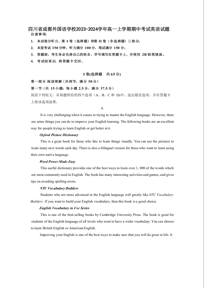 四川省成都外国语学校2023-2024学年高一上学期期中考试英语