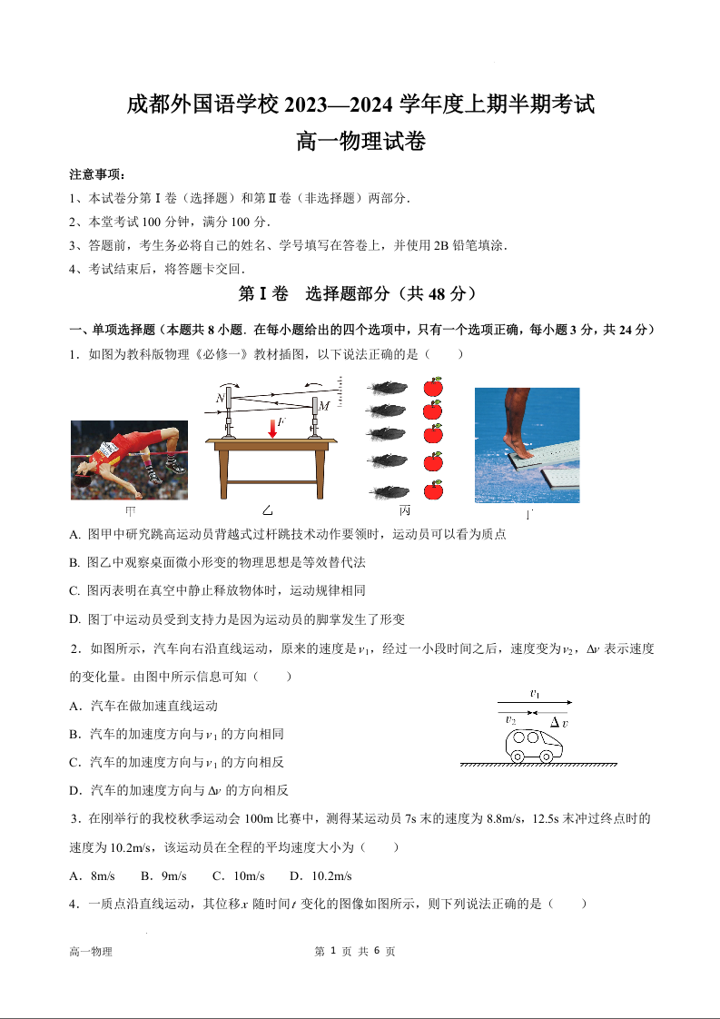 四川省成都外国语学校2023-2024学年高一上学期期中考试物理