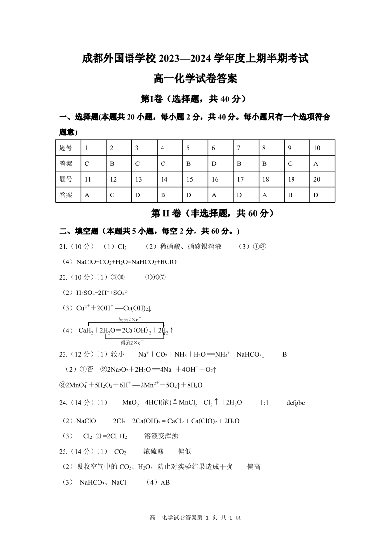 四川省成都外国语学校2023-2024学年高一上学期期中考试化学答案