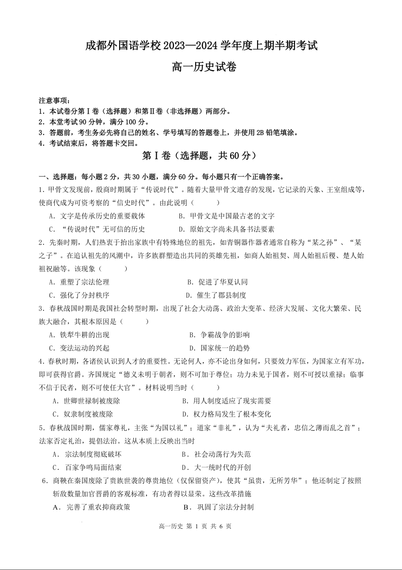 四川省成都外国语学校2023-2024学年高一上学期期中考试历史