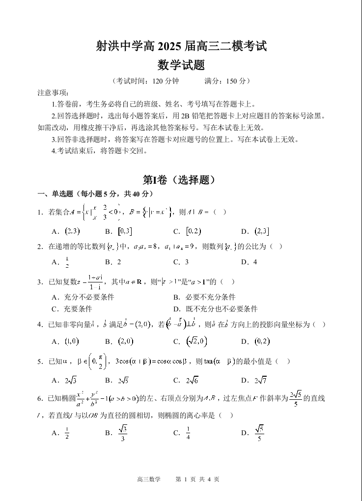四川省射洪中学2024-2025学年下学期3月高三二模数学