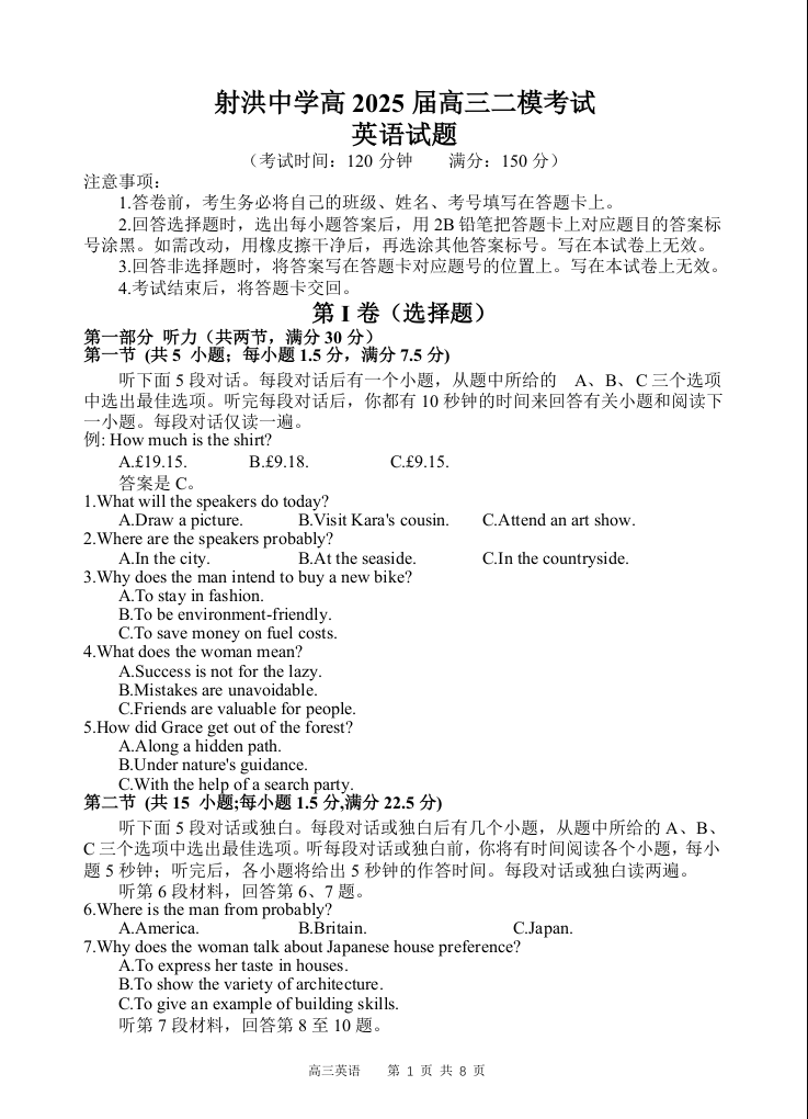 四川省射洪中学2024-2025学年下学期3月高三二模英语