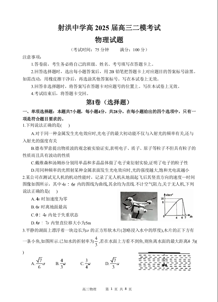 四川省射洪中学2024-2025学年下学期3月高三二模物理