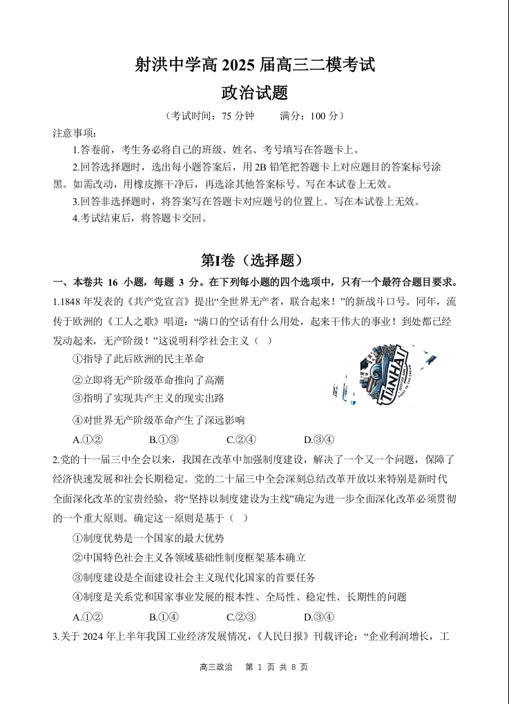四川省射洪中学2024-2025学年下学期3月高三二模政治