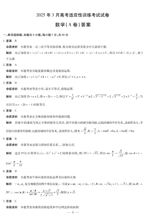 山西省晋中市区域2024-2025学年下学期3月高三适应性训练(二模)数学答案