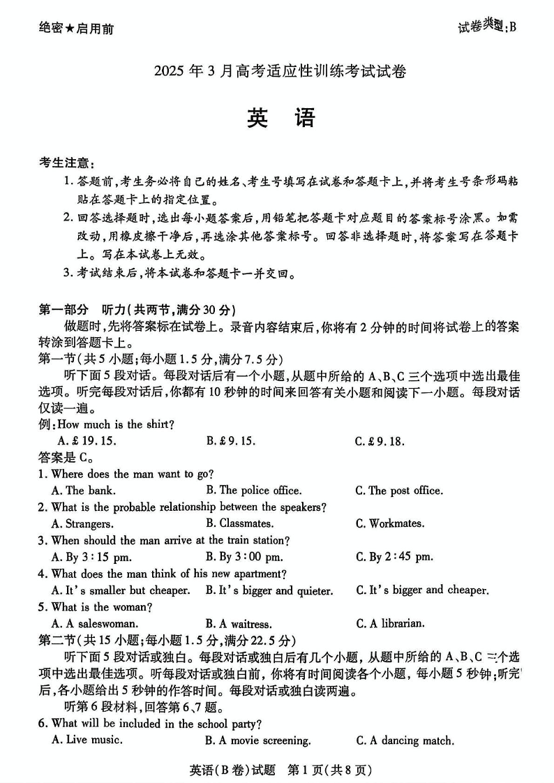 山西省晋中市区域2024-2025学年下学期3月高三适应性训练(二模)英语+答案