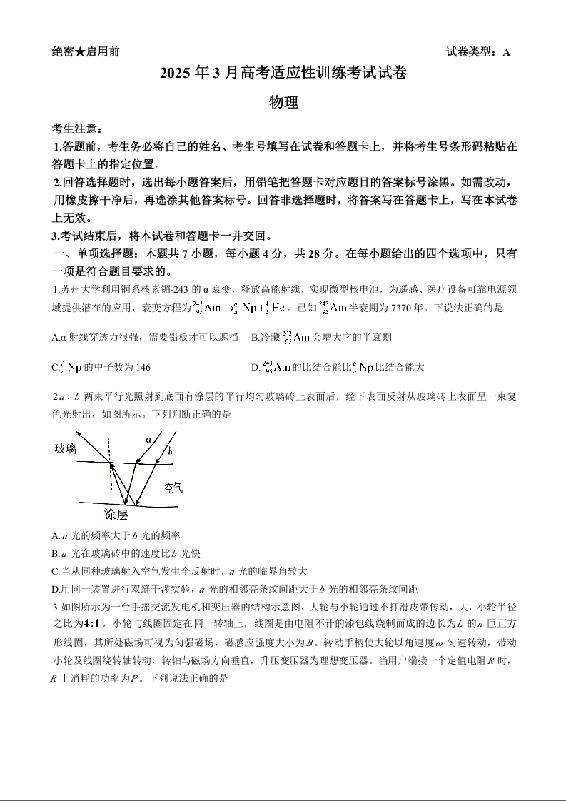 山西省晋中市区域2024-2025学年下学期3月高三适应性训练(二模)物理+答案