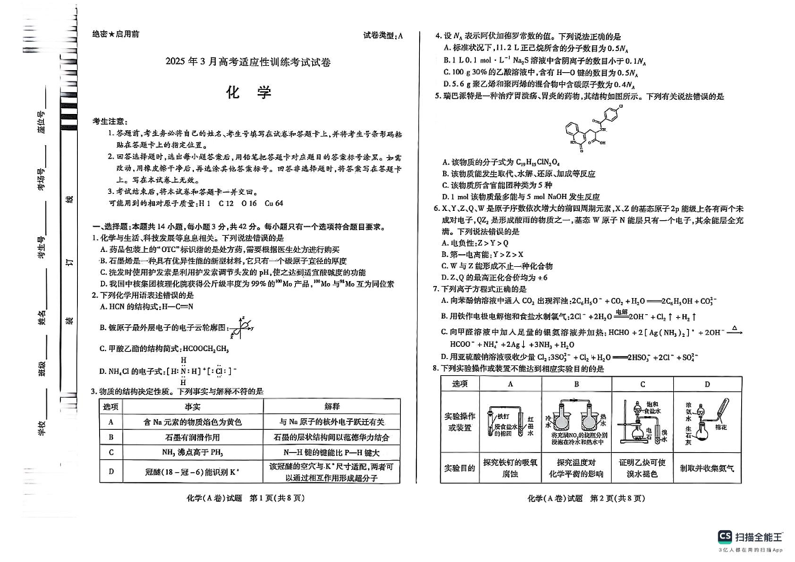 山西省晋中市区域2024-2025学年下学期3月高三适应性训练(二模)化学