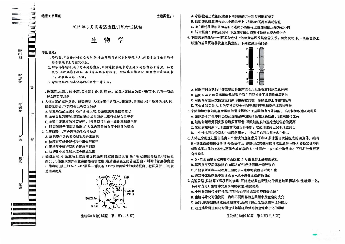 山西省晋中市区域2024-2025学年下学期3月高三适应性训练(二模)生物