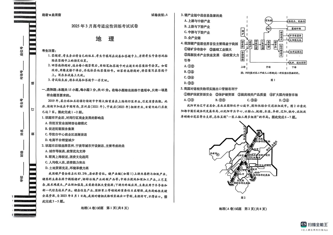 山西省晋中市区域2024-2025学年下学期3月高三适应性训练(二模)地理