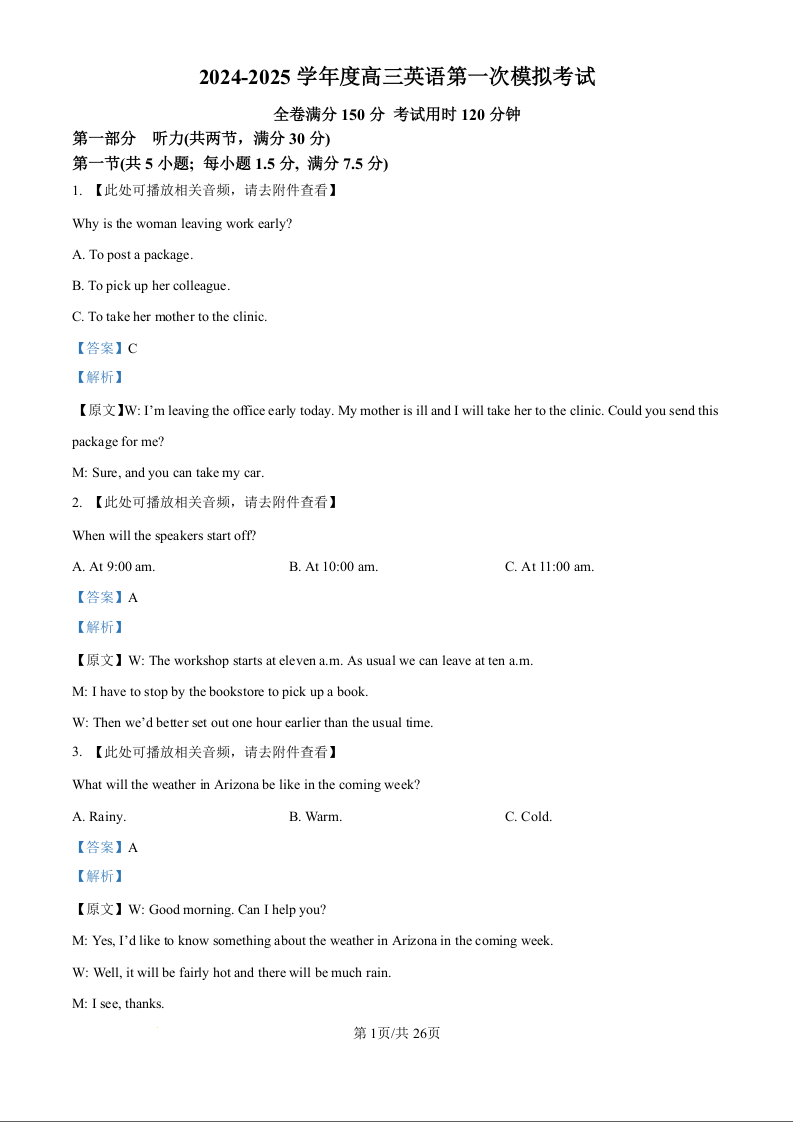 宁夏石嘴山市第一中学2024-2025学年下学期高三一模考试英语(精品解析版)