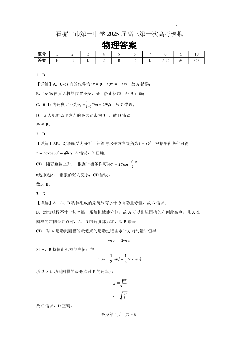 宁夏石嘴山市第一中学2024-2025学年下学期高三一模考试物理答案