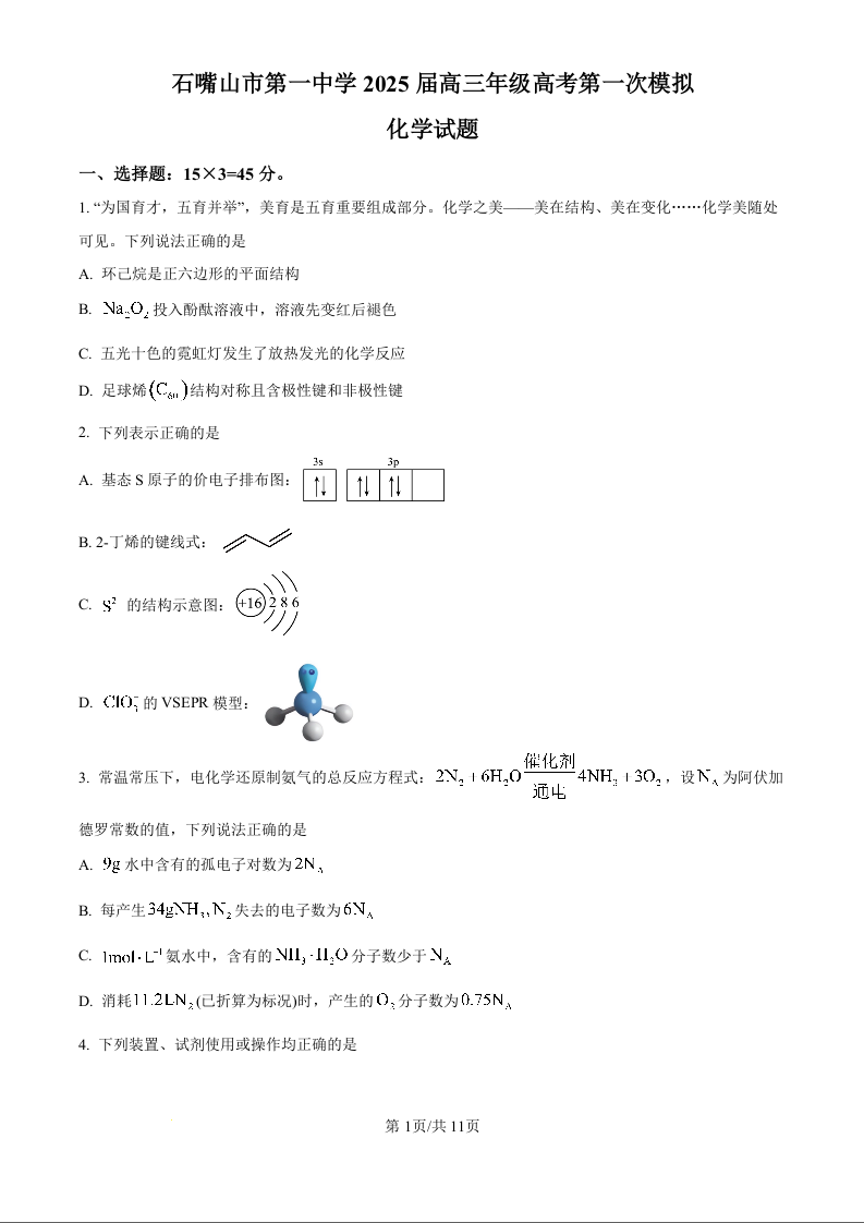 宁夏石嘴山市第一中学2024-2025学年下学期高三一模考试化学(原卷版)