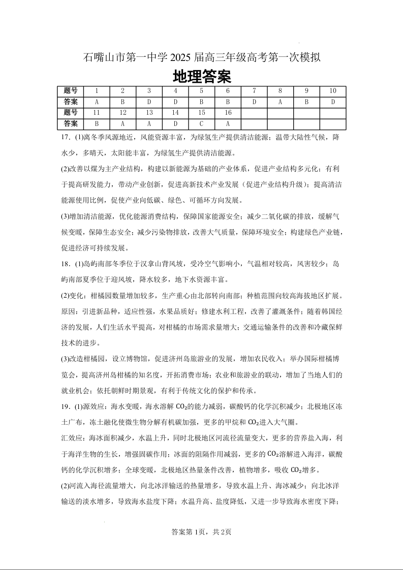 宁夏石嘴山市第一中学2024-2025学年下学期高三一模考试地理答案