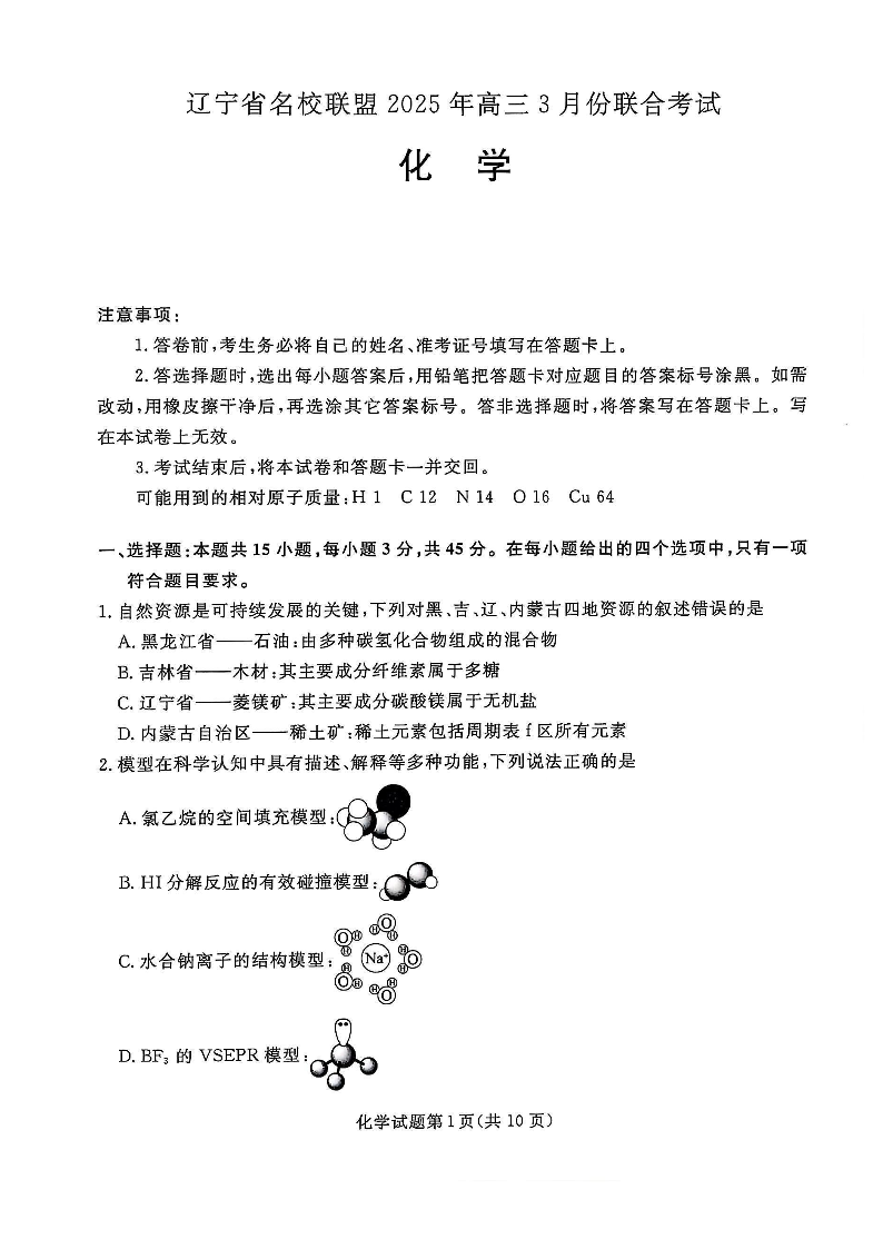 辽宁省名校联盟2024-2025学年下学期3月高三联合考试化学