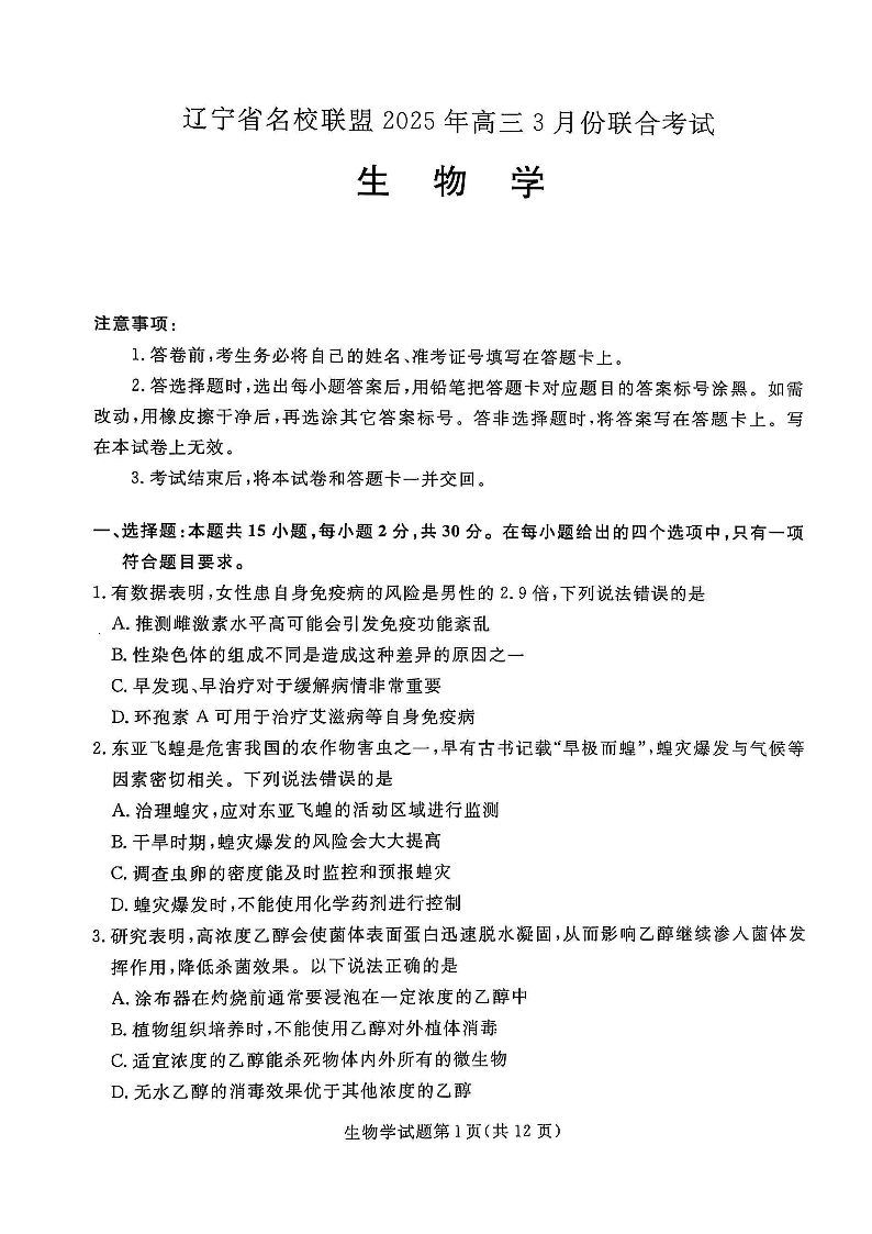 辽宁省名校联盟2024-2025学年下学期3月高三联合考试生物