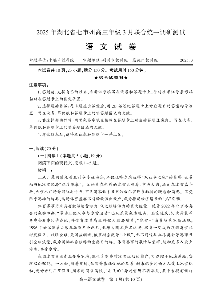 湖北省七市州2024-2025学年下学期3月高三联合统一调研测试语文