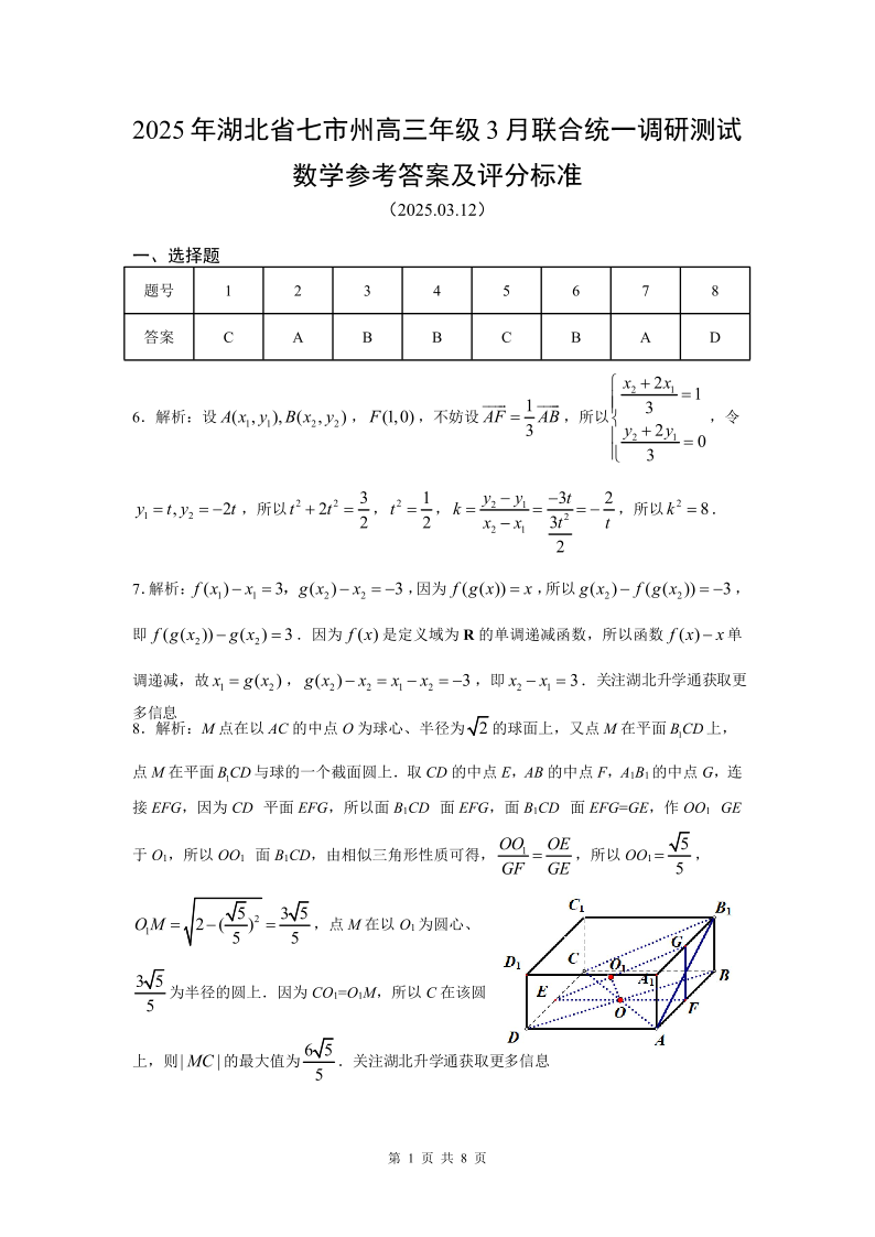 湖北省七市州2024-2025学年下学期3月高三联合统一调研测试数学答案