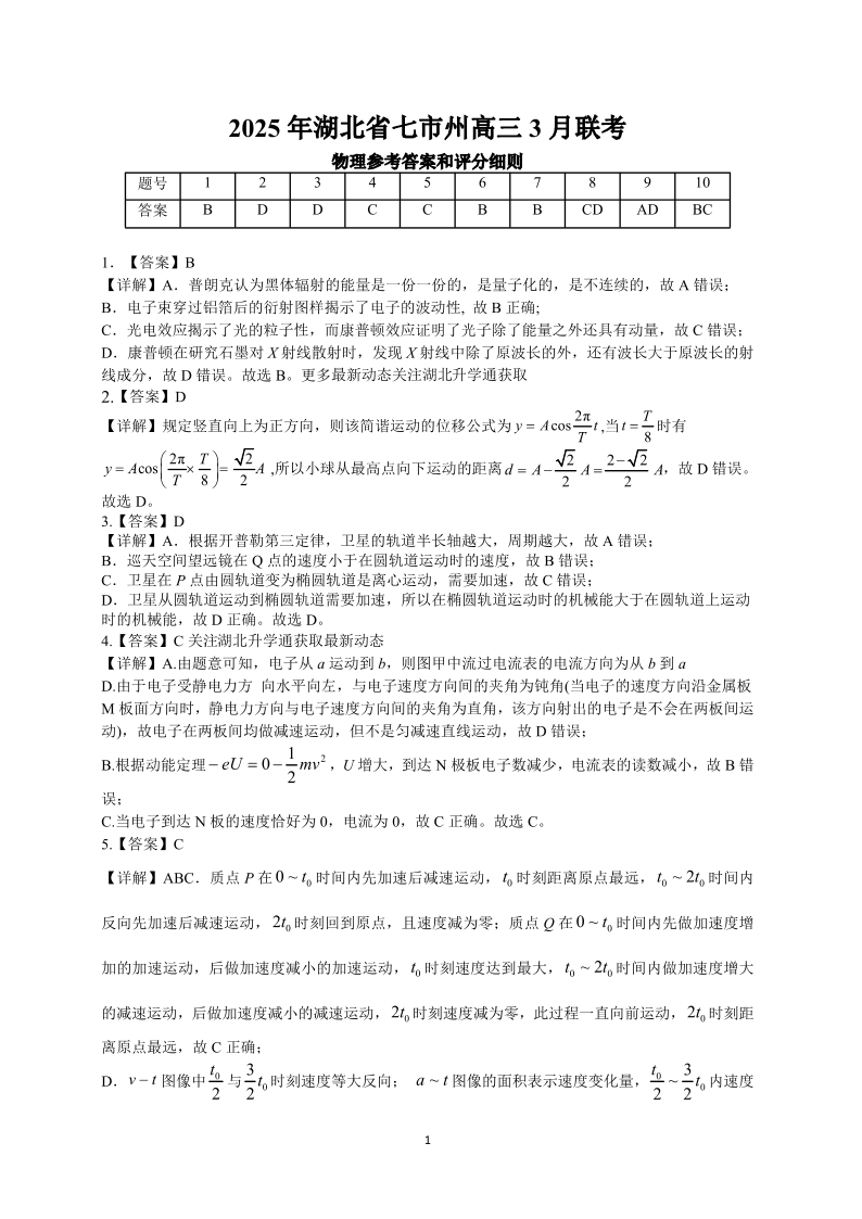 湖北省七市州2024-2025学年下学期3月高三联合统一调研测试物理答案
