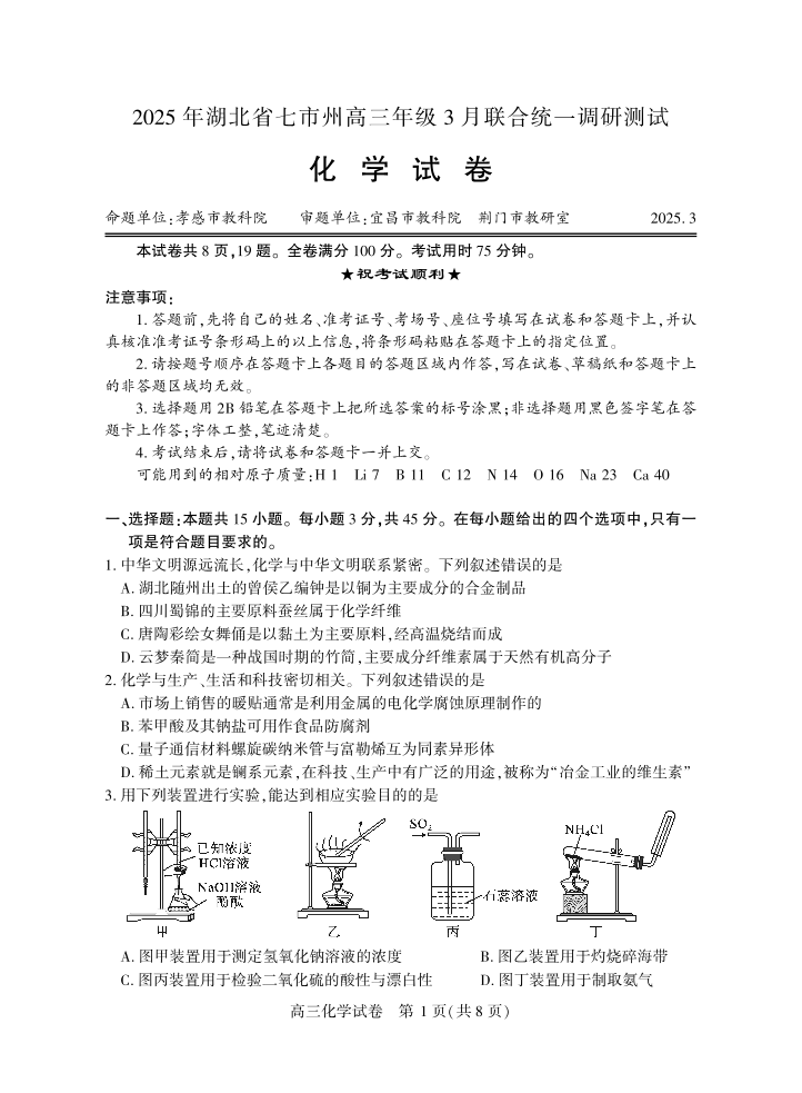 湖北省七市州2024-2025学年下学期3月高三联合统一调研测试化学