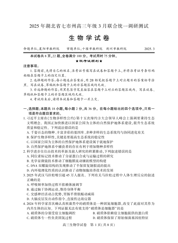 湖北省七市州2024-2025学年下学期3月高三联合统一调研测试生物
