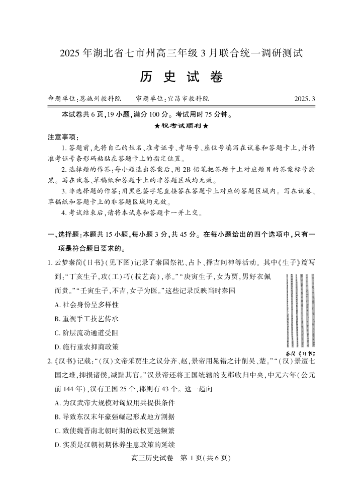 湖北省七市州2024-2025学年下学期3月高三联合统一调研测试历史