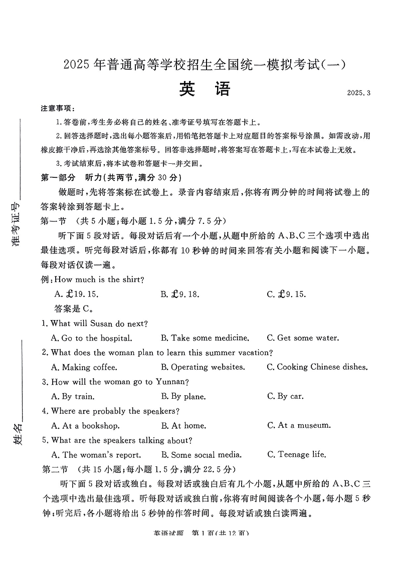 河北省承德+张家口市2024-2025学年下学期高三一模考试英语