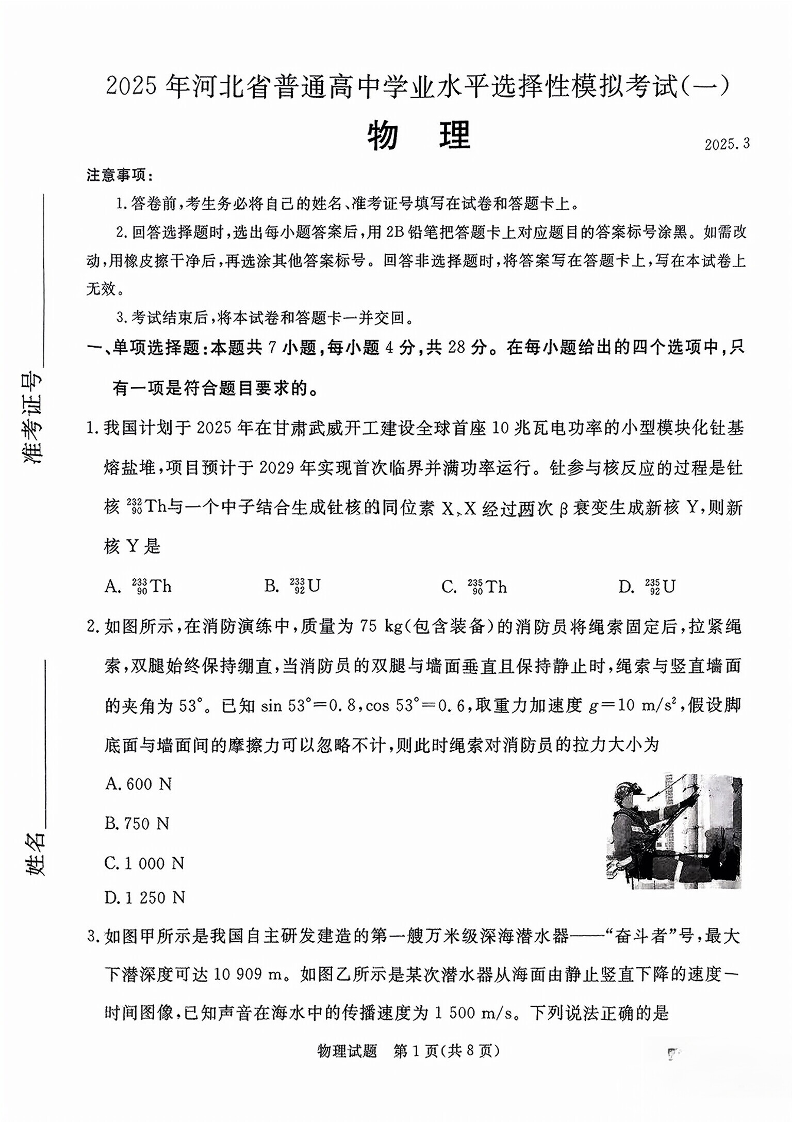 河北省承德+张家口市2024-2025学年下学期高三一模考试物理