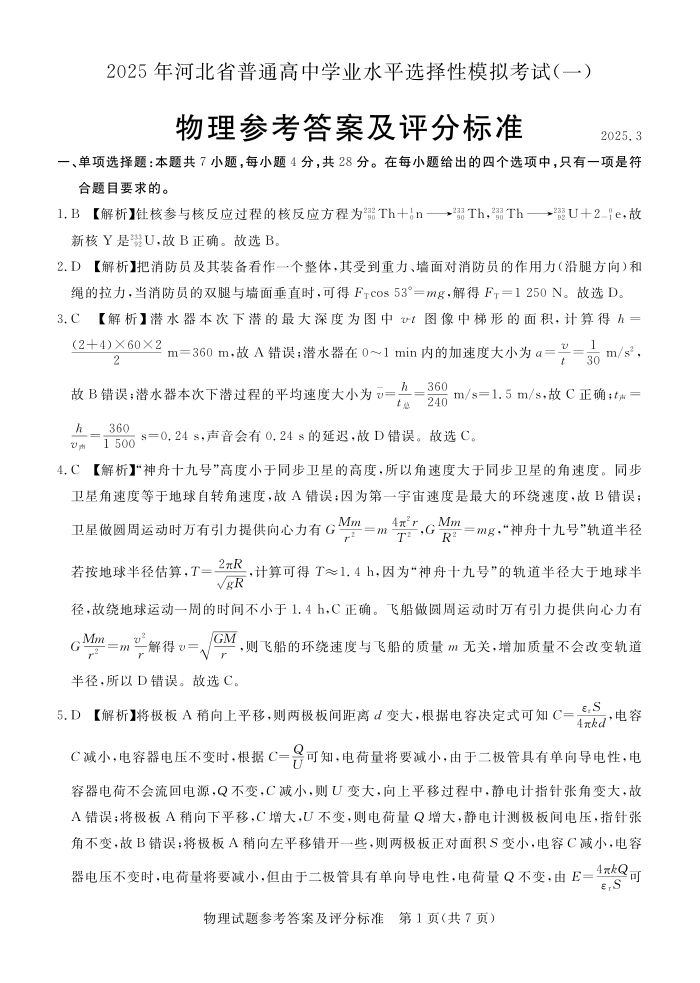 河北省承德+张家口市2024-2025学年下学期高三一模考试物理答案