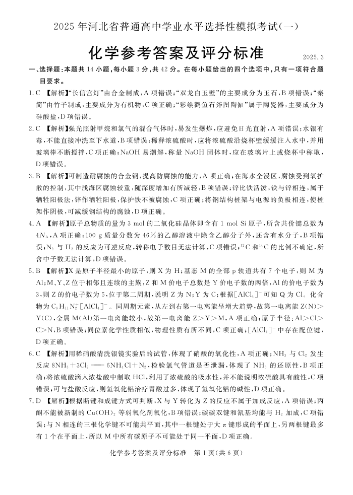 河北省承德+张家口市2024-2025学年下学期高三一模考试化学答案