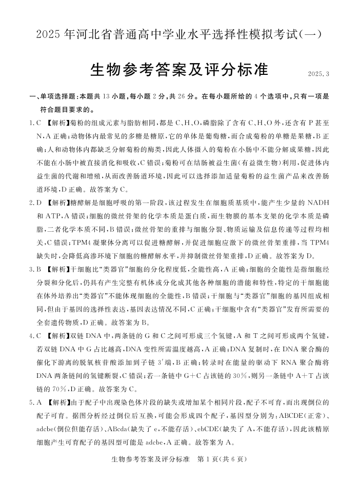 河北省承德+张家口市2024-2025学年下学期高三一模考试生物答案