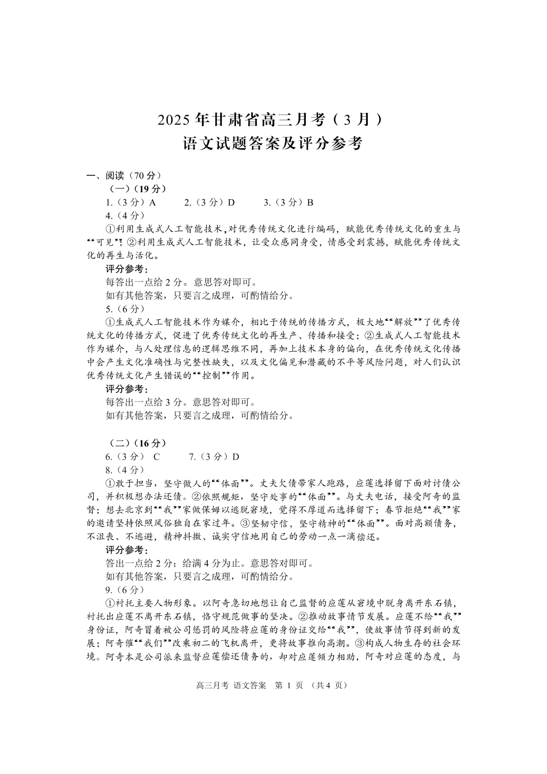 甘肃省2024-2025学年下学期3月高三一诊联考语文答案