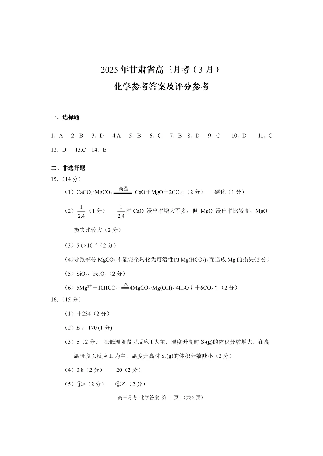 甘肃省2024-2025学年下学期3月高三一诊联考化学答案