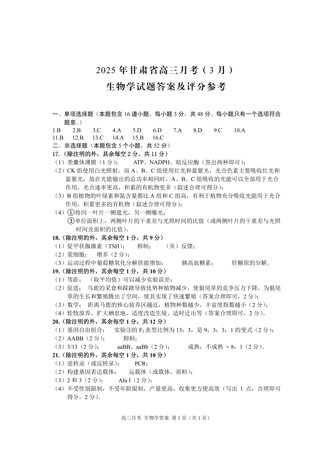 甘肃省2024-2025学年下学期3月高三一诊联考生物答案