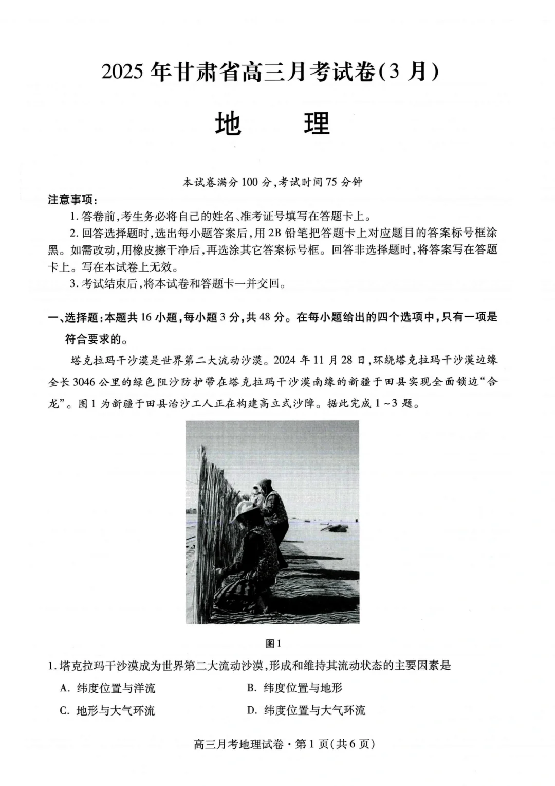 甘肃省2024-2025学年下学期3月高三一诊联考地理