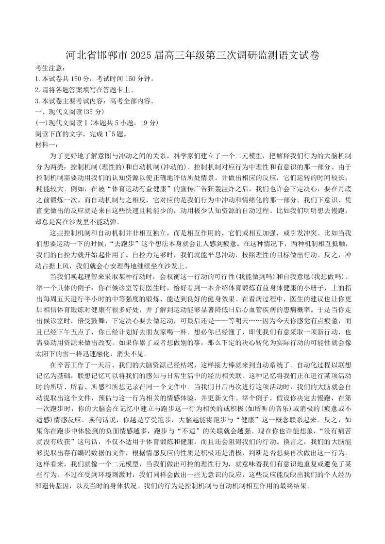 河北省邯郸市2024-2025学年下学期高三三模调研监测语文+答案