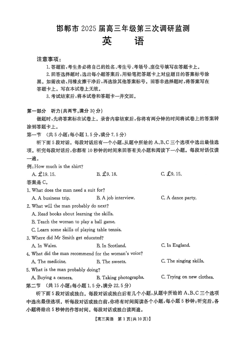 河北省邯郸市2024-2025学年下学期高三三模调研监测英语+答案