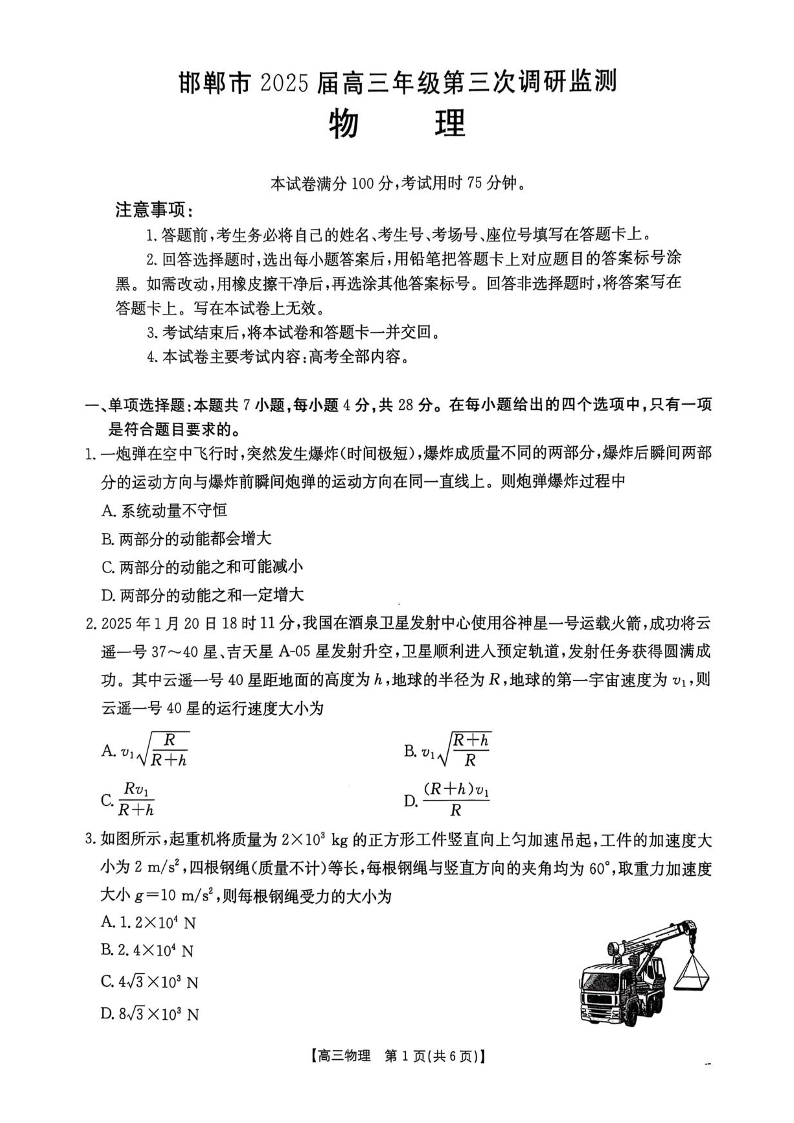河北省邯郸市2024-2025学年下学期高三三模调研监测物理+答案