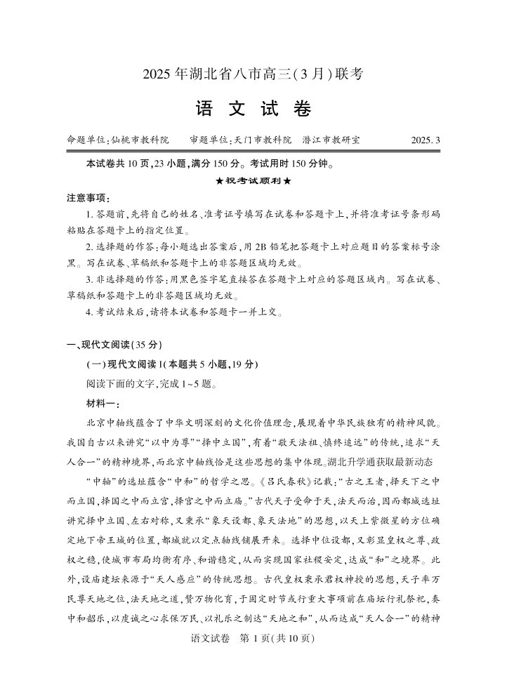 湖北省八市2024-2025学年下学期3月高三联考语文