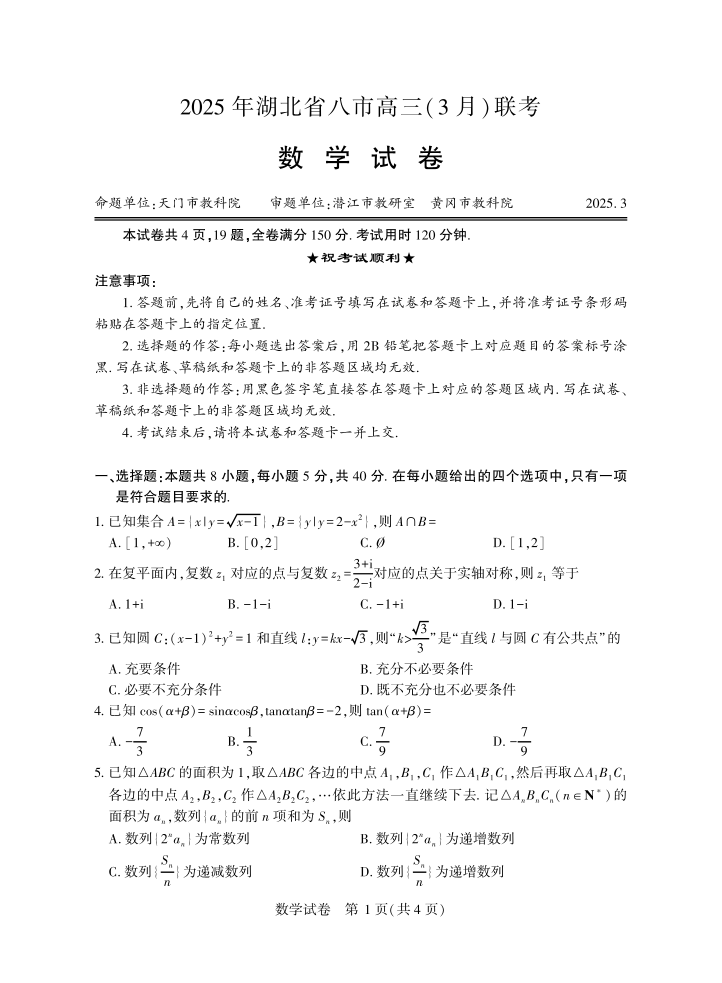 湖北省八市2024-2025学年下学期3月高三联考数学