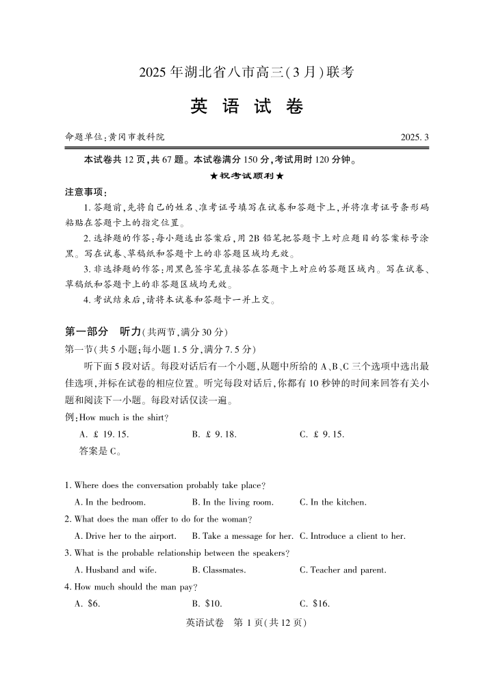 湖北省八市2024-2025学年下学期3月高三联考英语
